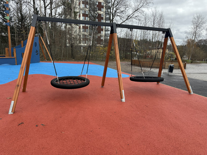Double Bay Wooden Swing w/ Bird Nest Seats (⌀ 120 cm) offers an engaging and comfortable swinging experience for children aged 2 and above, combining spacious bird nest seats with a robust wooden frame designed for outdoor recreational areas.