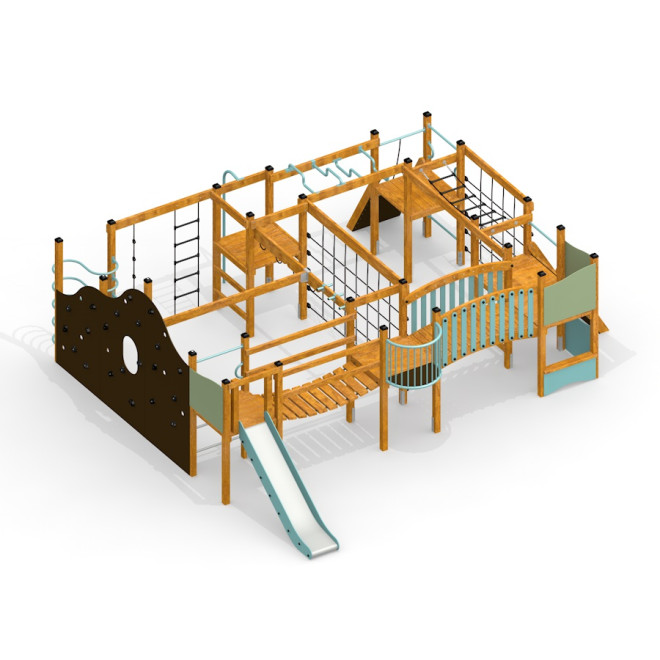 This playground equipment is crafted from high-quality larch wood combined with durable stainless steel and galvanised steel components, ensuring longevity and resistance to weathering. The use of recycled HDPE and robust PP ropes, both reinforced and soft, adds to the structure’s resilience and tactile appeal. Anti-slip waterproof plywood enhances safety on platforms, while the integration of PP and PE materials ensures the equipment remains sturdy and low maintenance.