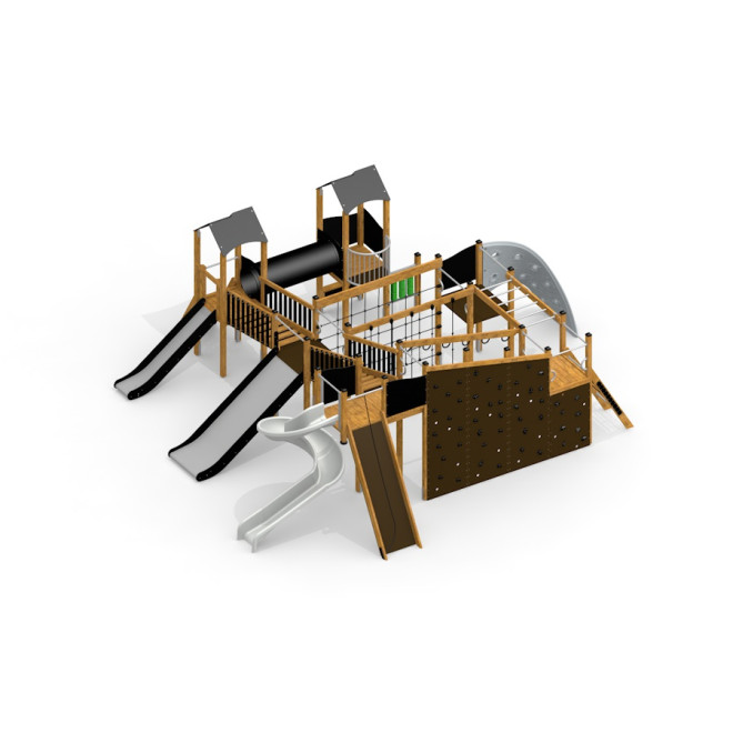 Crafted from a robust combination of larch wood and pine wood, Mastodont features durable stainless steel and galvanised steel elements for structural strength. The use of reinforced and soft PP ropes enhances climbing experiences while ensuring flexibility and safety. Components such as fibreglass, anti-slip waterproof plywood, HDPE, LLDPE, PP, and PE contribute to a resilient and weather-resistant design that maintains its aesthetic appeal over time.